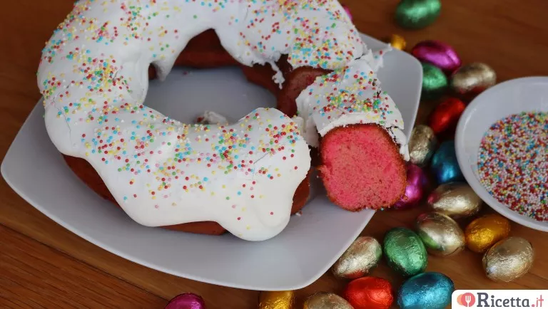 Si tratta di una soffice ciambella rossa all’Alchermes, ricoperta da una nuvola di meringa bianca e decorata con confettini colorati: un contrasto di colori e consistenze che rende questo dolce unico e immediatamente riconoscibile.