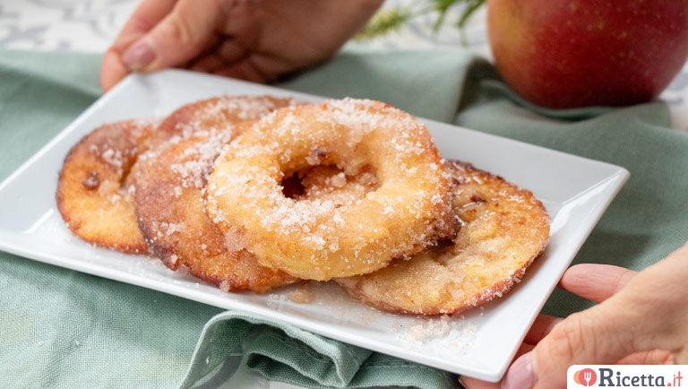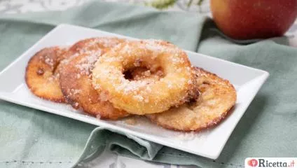 Le mele vengono tagliate orizzontalmente e forate al centro per eliminare la parte del torsolo e dei semi, quindi passate nella pastella e cotte.