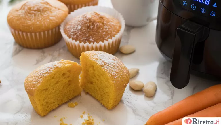 Muffin alle carote in friggitrice ad aria: soffici, profumati e ricchi di gusto, si preparano facilmente con ingredienti semplici come farina, uova, zucchero, olio di semi, carote fresche e mandorle pelate.