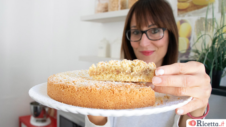 L'impasto invece viene definito "a briciole" ed è un composto semplice ma irresistibile che si prepara senza bisogno di stendere nulla. Farina, zucchero, uova e burro si lavorano velocemente in una ciotola con la punta delle dita fino a ottenere una sabbia grossolana, morbida e irregolare: è proprio questa texture imperfetta a regalare alla torta la sua inconfondibile friabilità.
