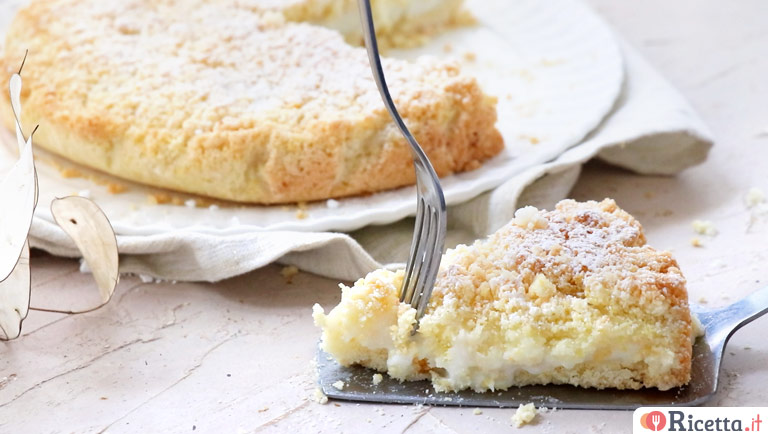 L’impasto, definito “a briciole”, è una preparazione semplice ma davvero golosa, simile alla pasta frolla che però non richiede di essere stesa. Farina, zucchero, uova e burro vengono mescolati rapidamente in una ciotola con le mani fino a formare un composto granuloso, soffice e irregolare, simile a una sabbia grossolana: è proprio questa consistenza un po’ rustica a dare alla torta la sua caratteristica friabilità.